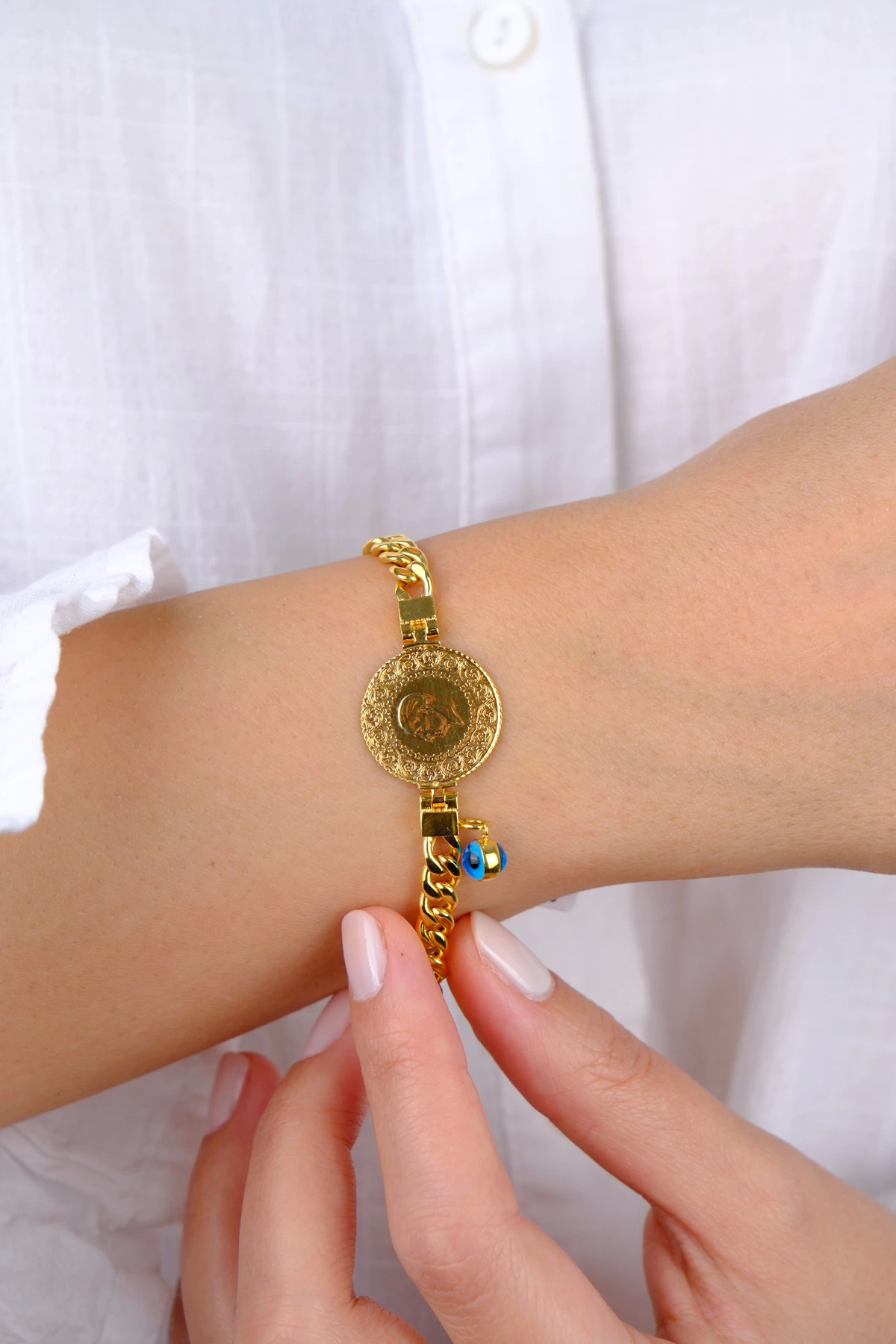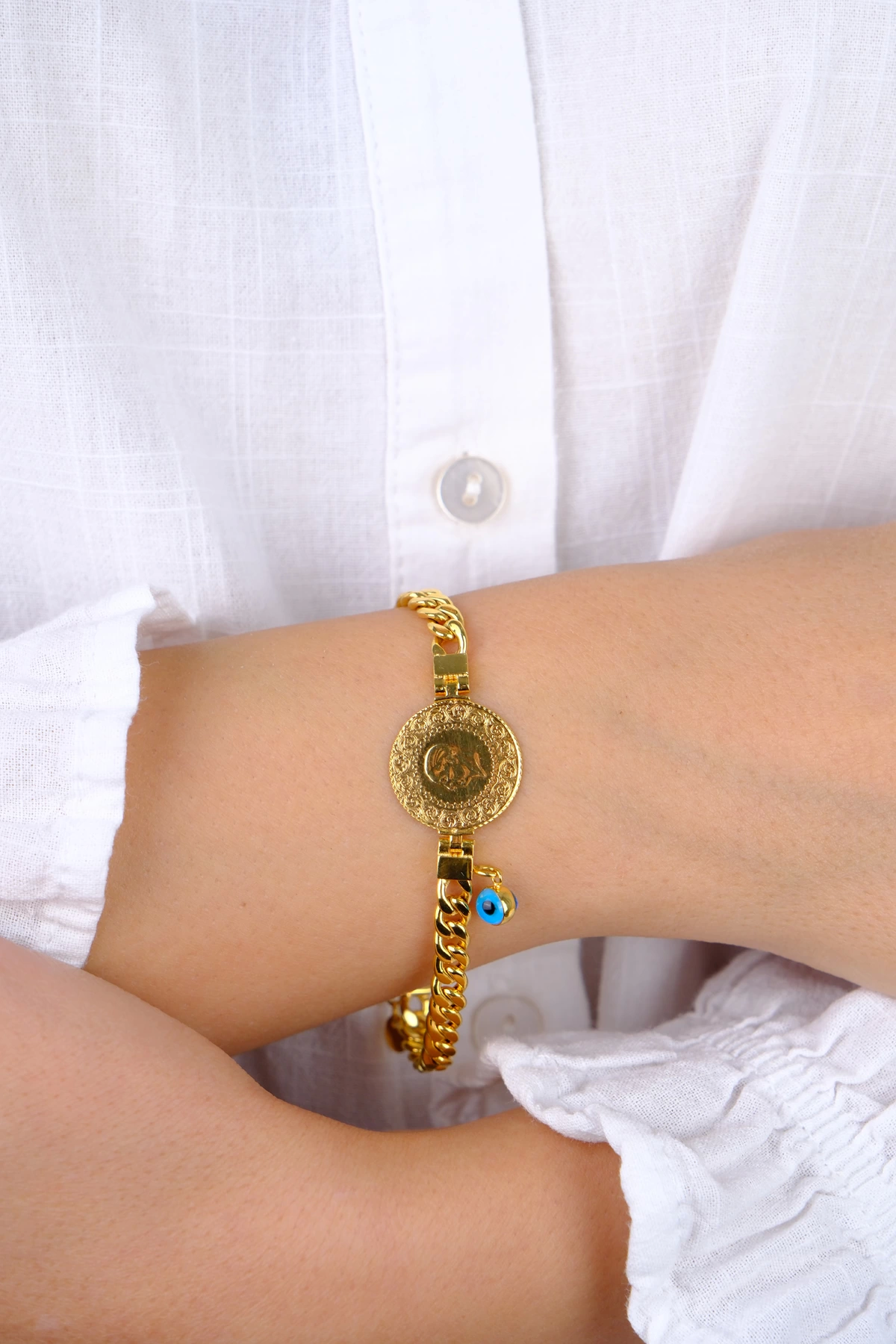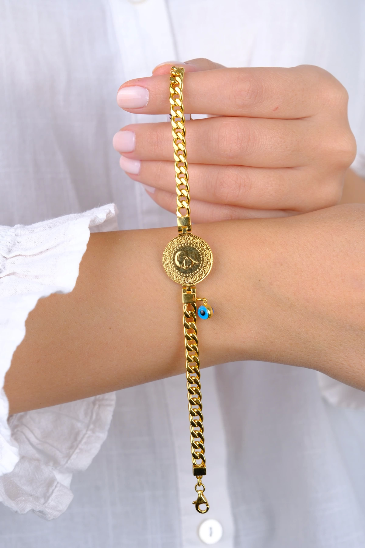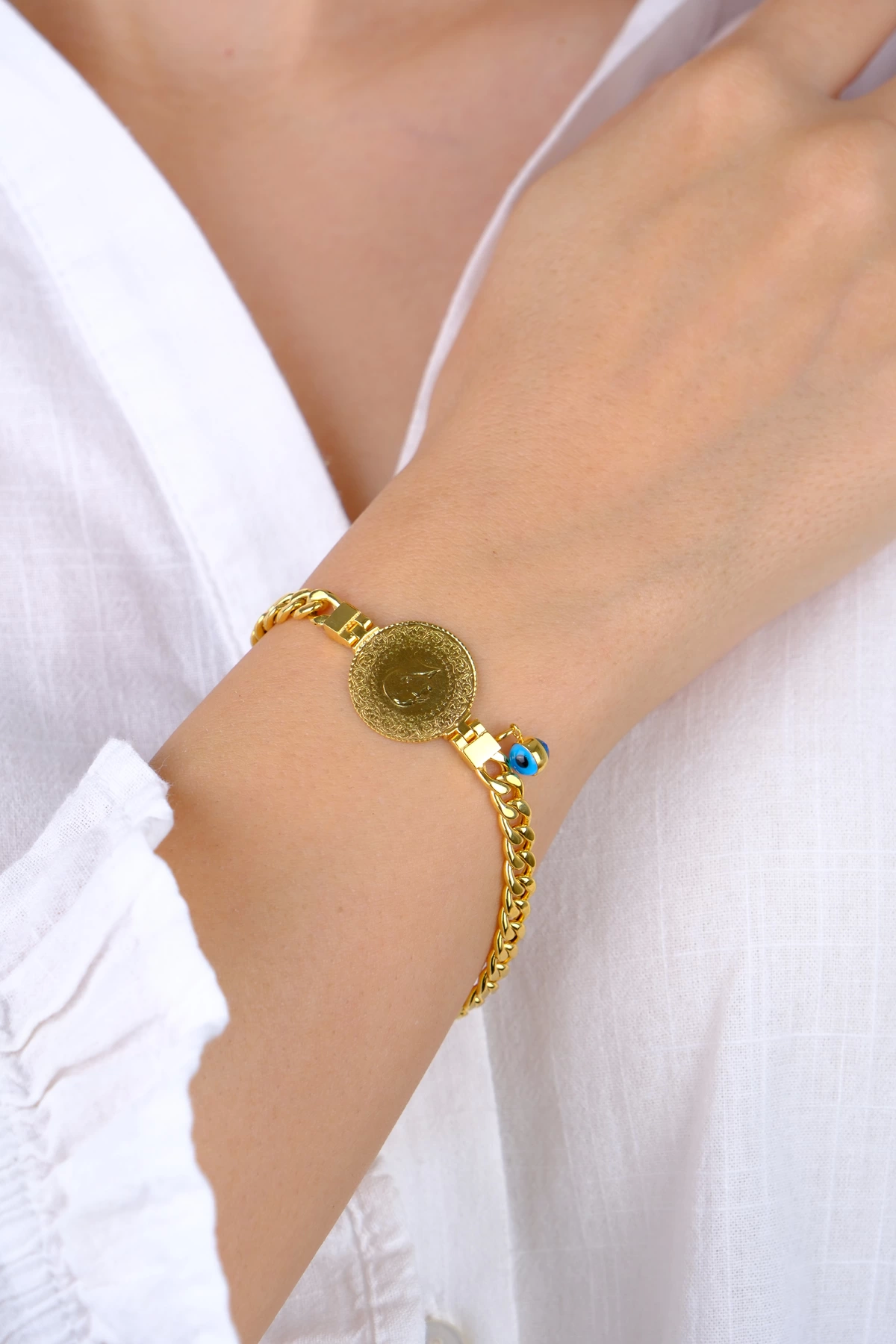 - Bilekliğin zincir kısmı 14 ayar olup çeyreği 22 ayar 1.75 gram kulplu çeyrektir.