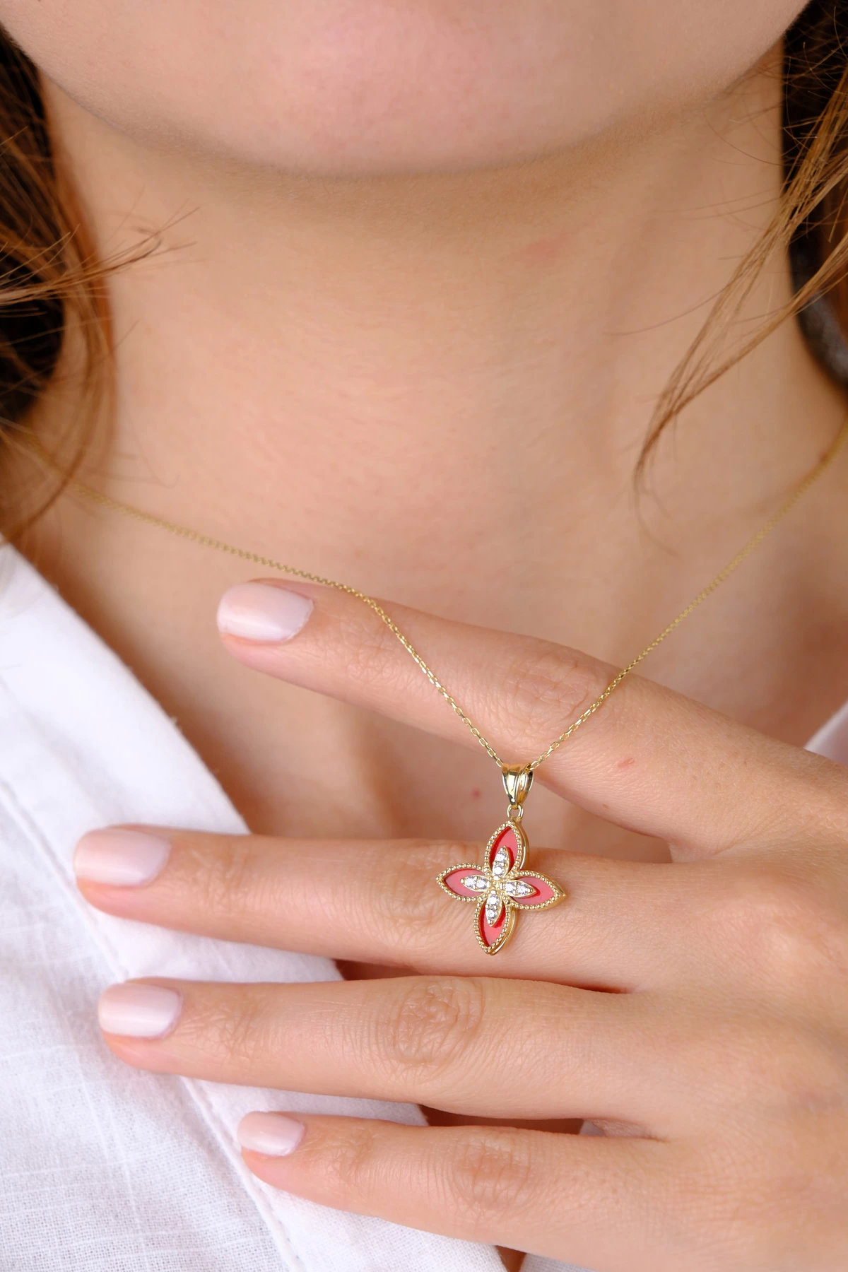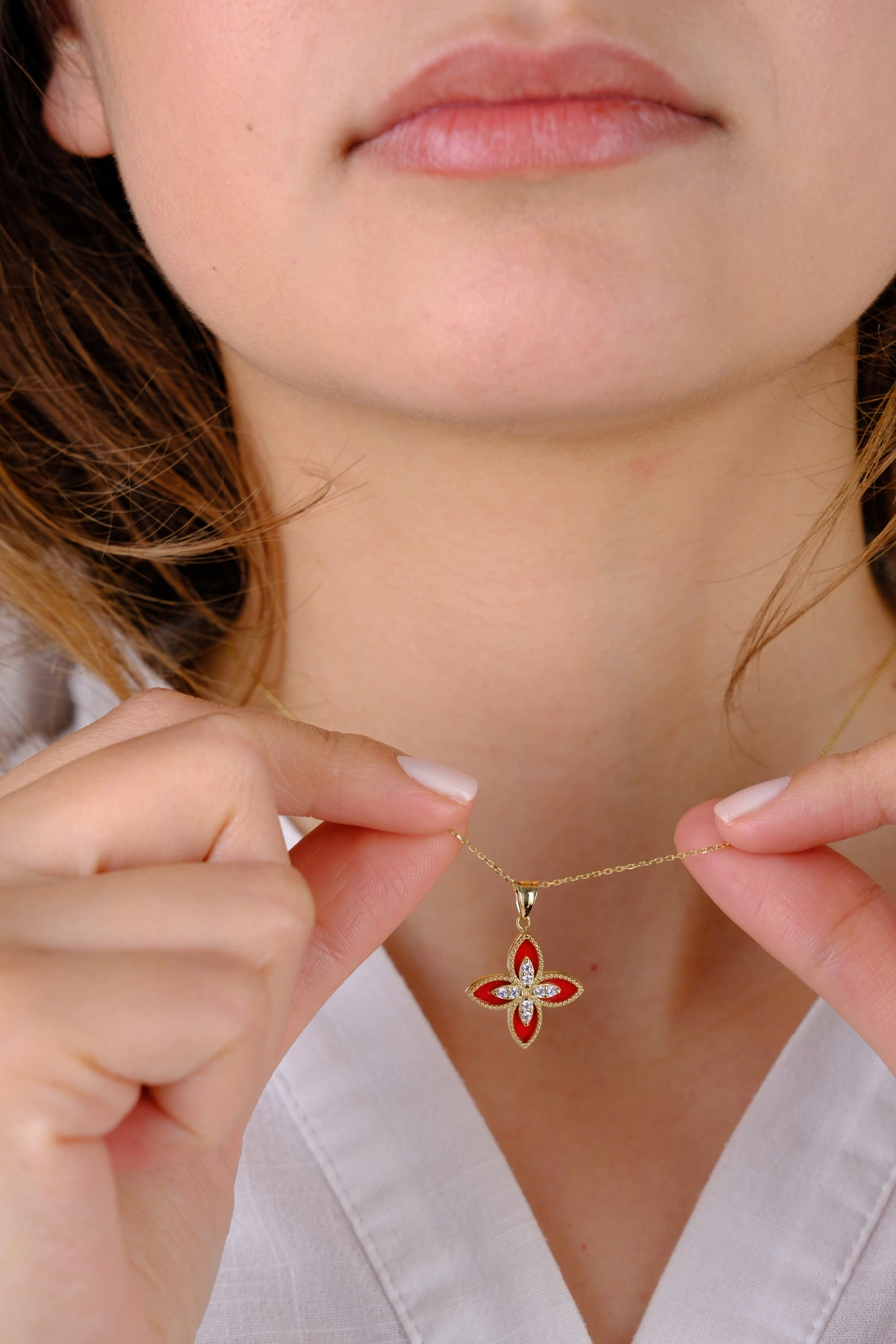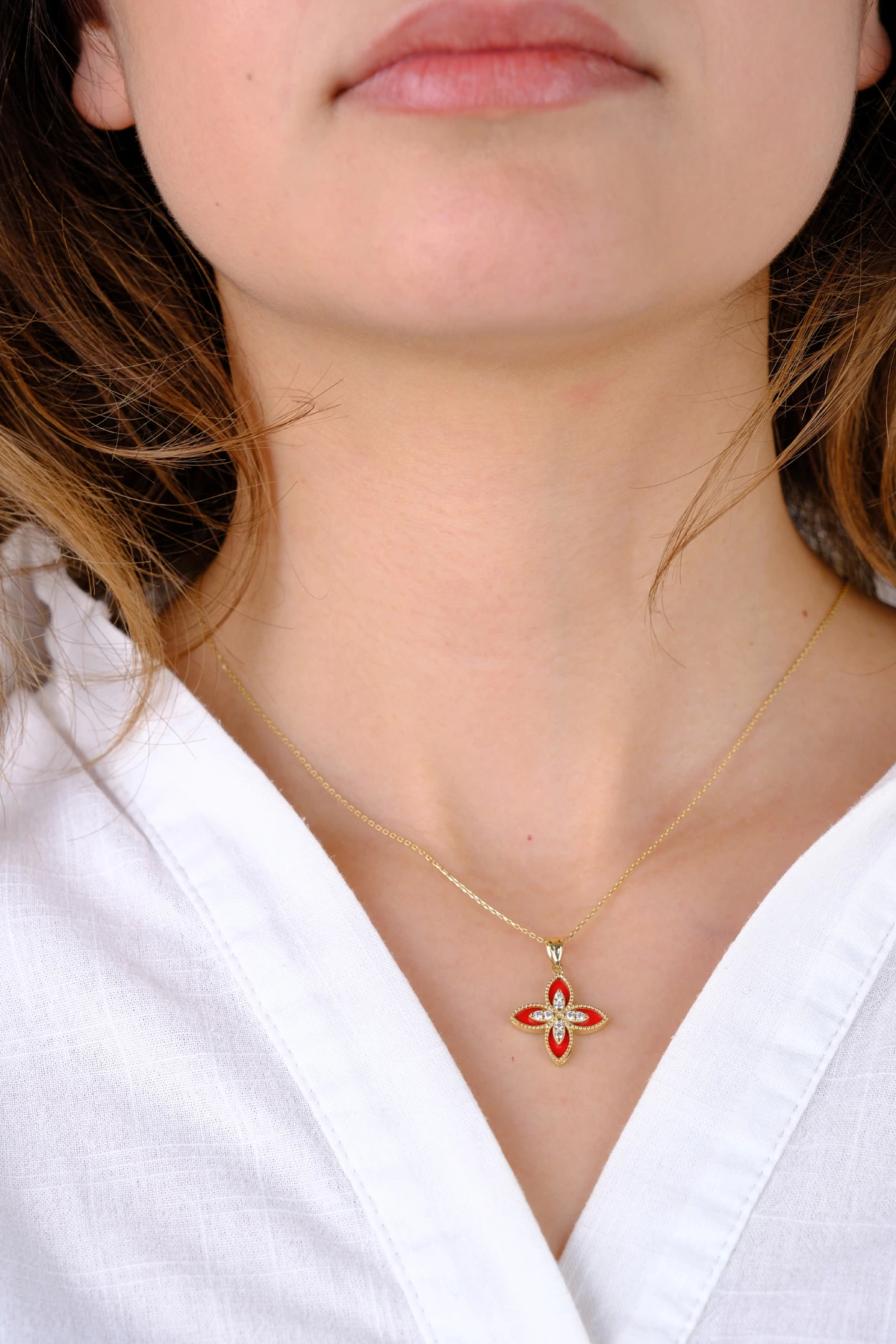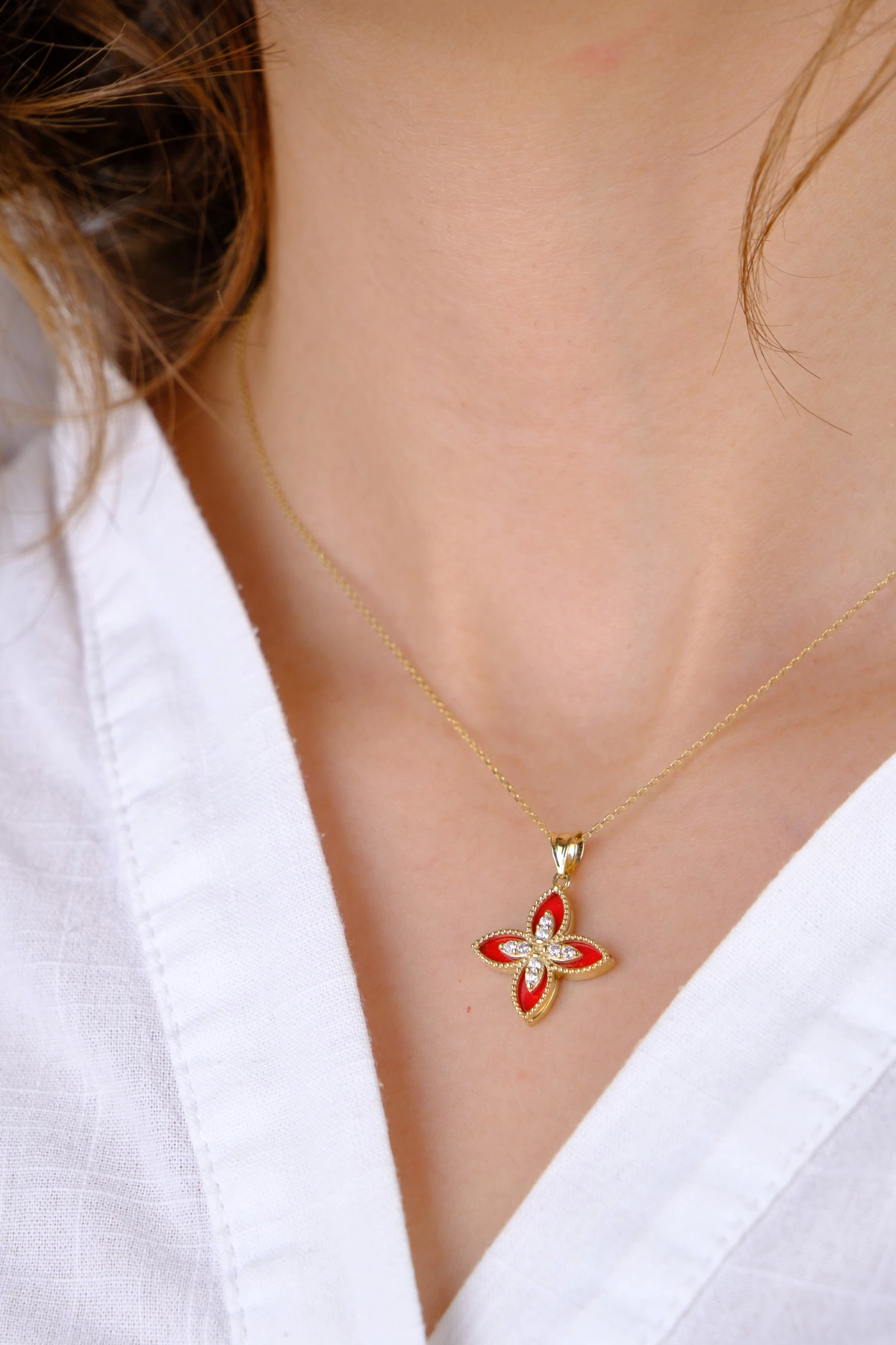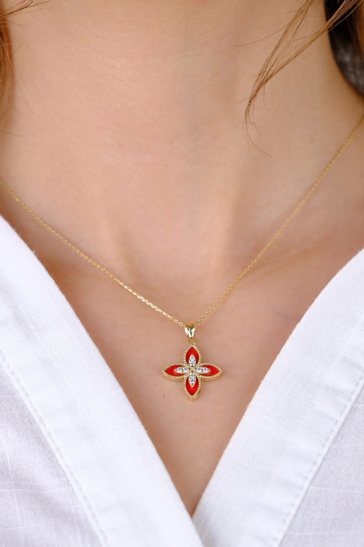 14 Ayar Altın Kırmızı Desenli Çiçekli Kolye Ucu 371