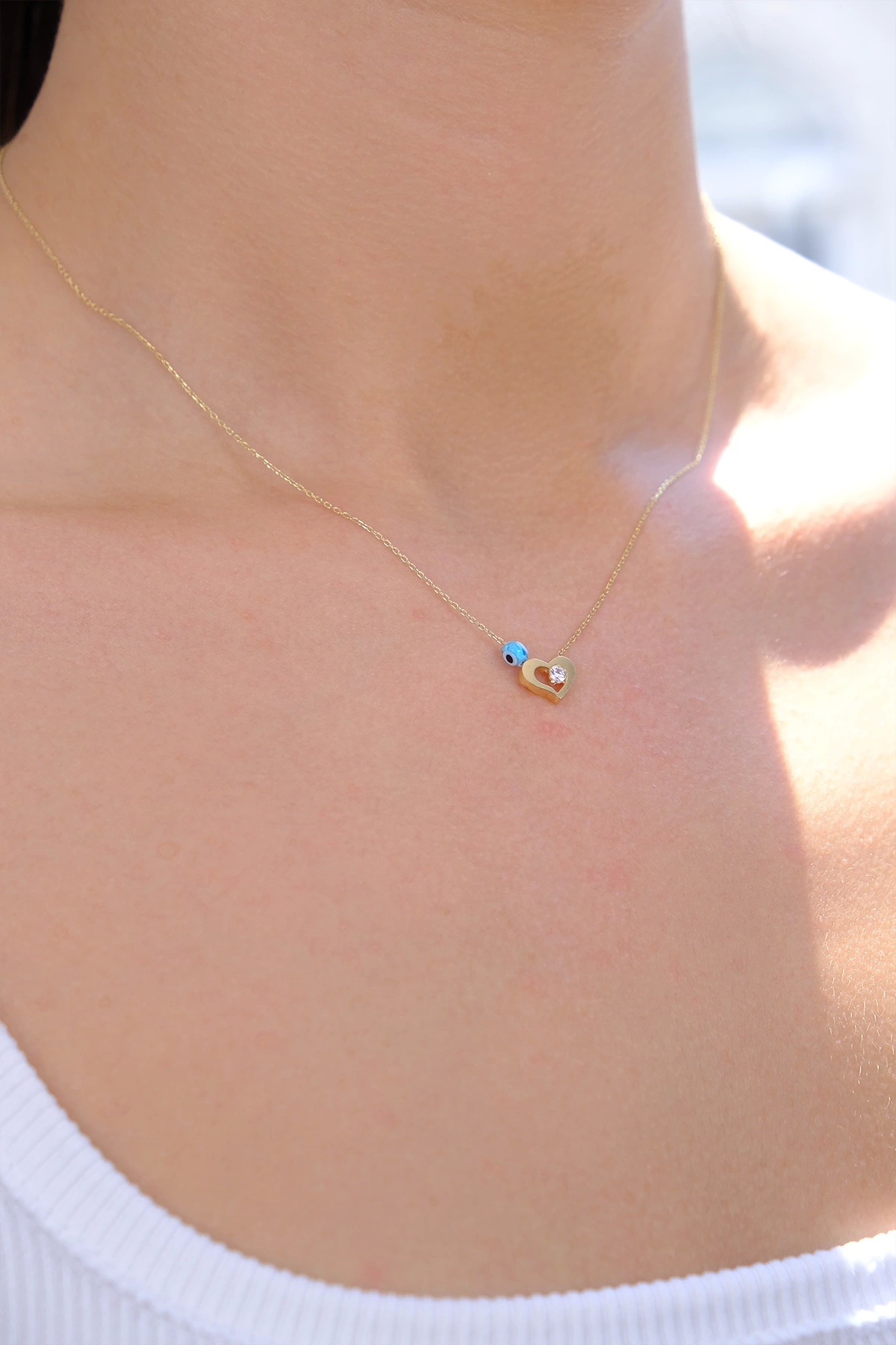 14 Ayar Altın Nazar Boncuklu Taşlı Minimal Kalp Kolye 103