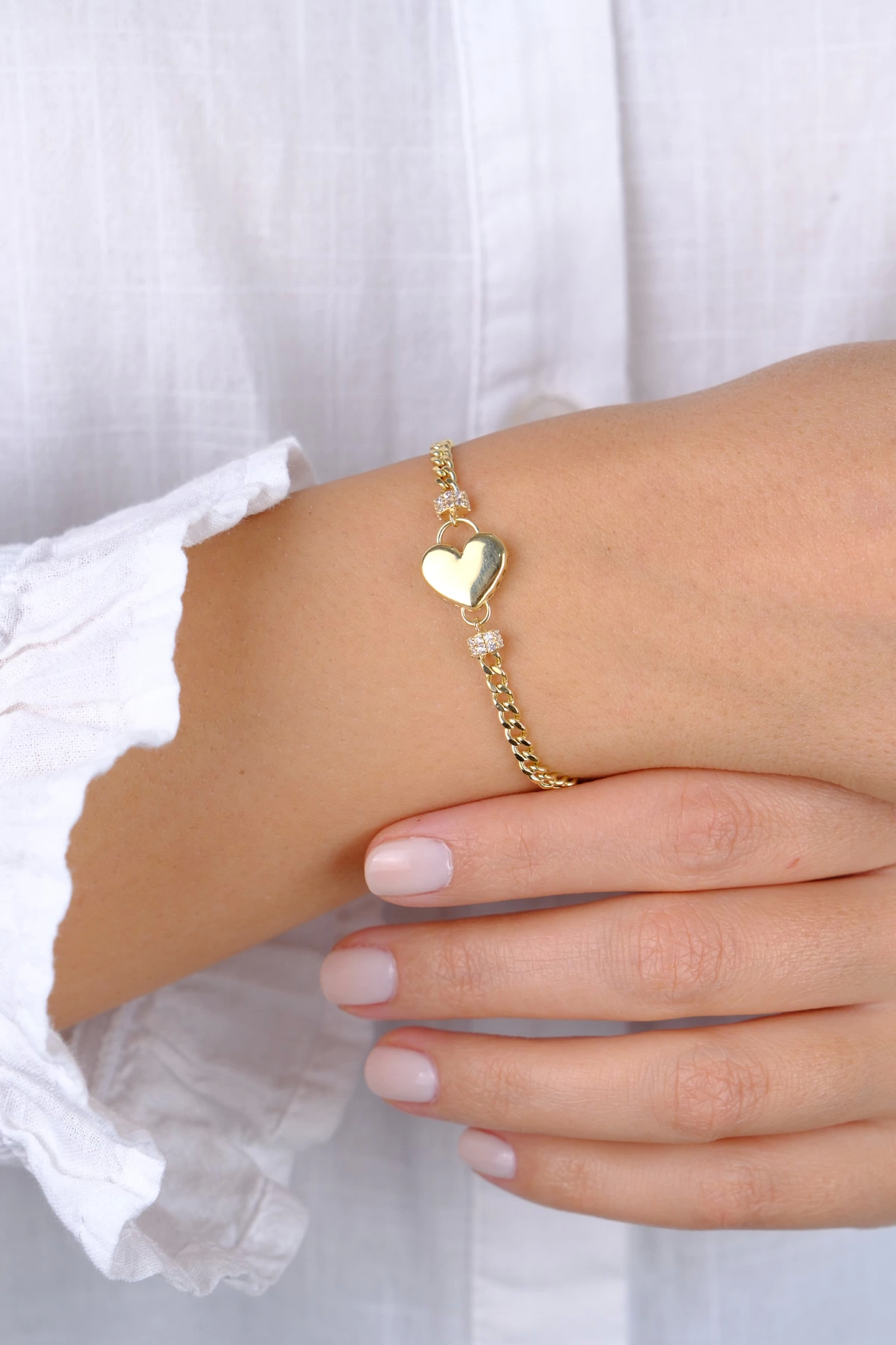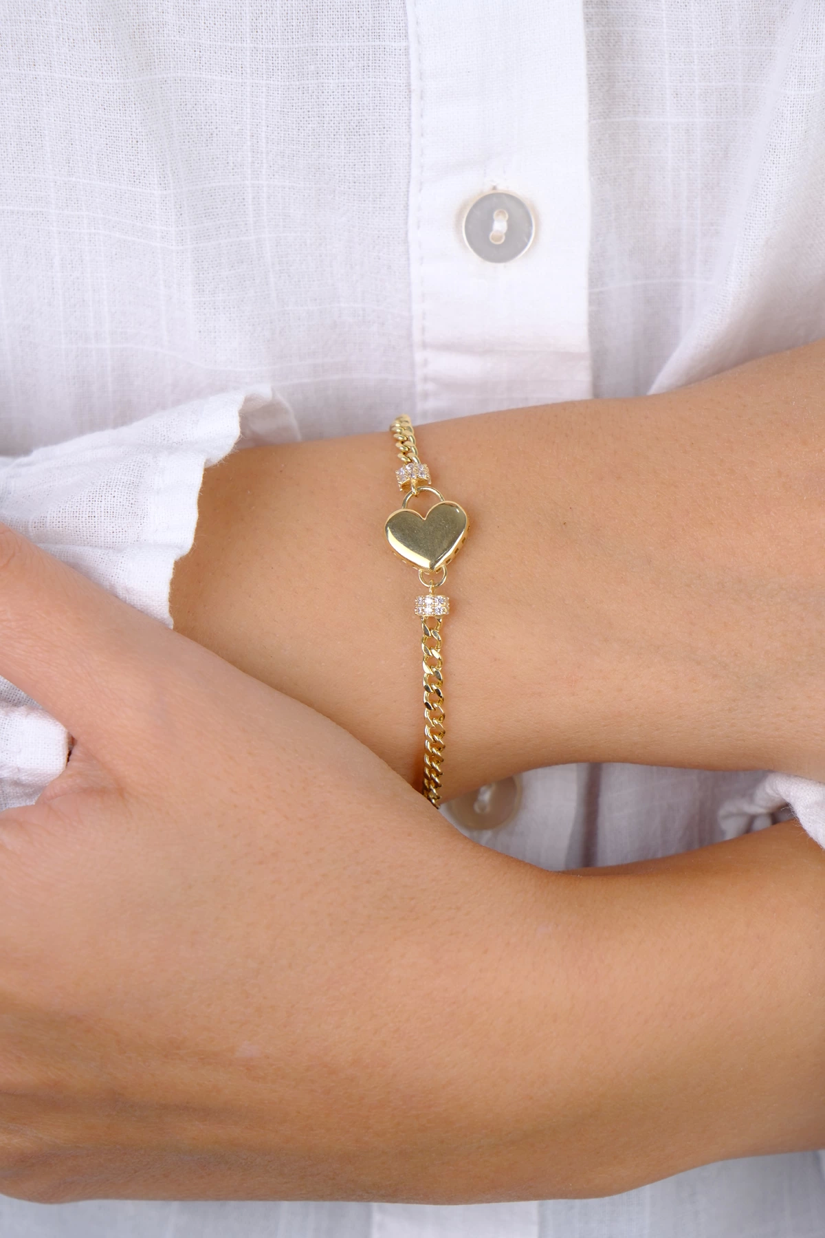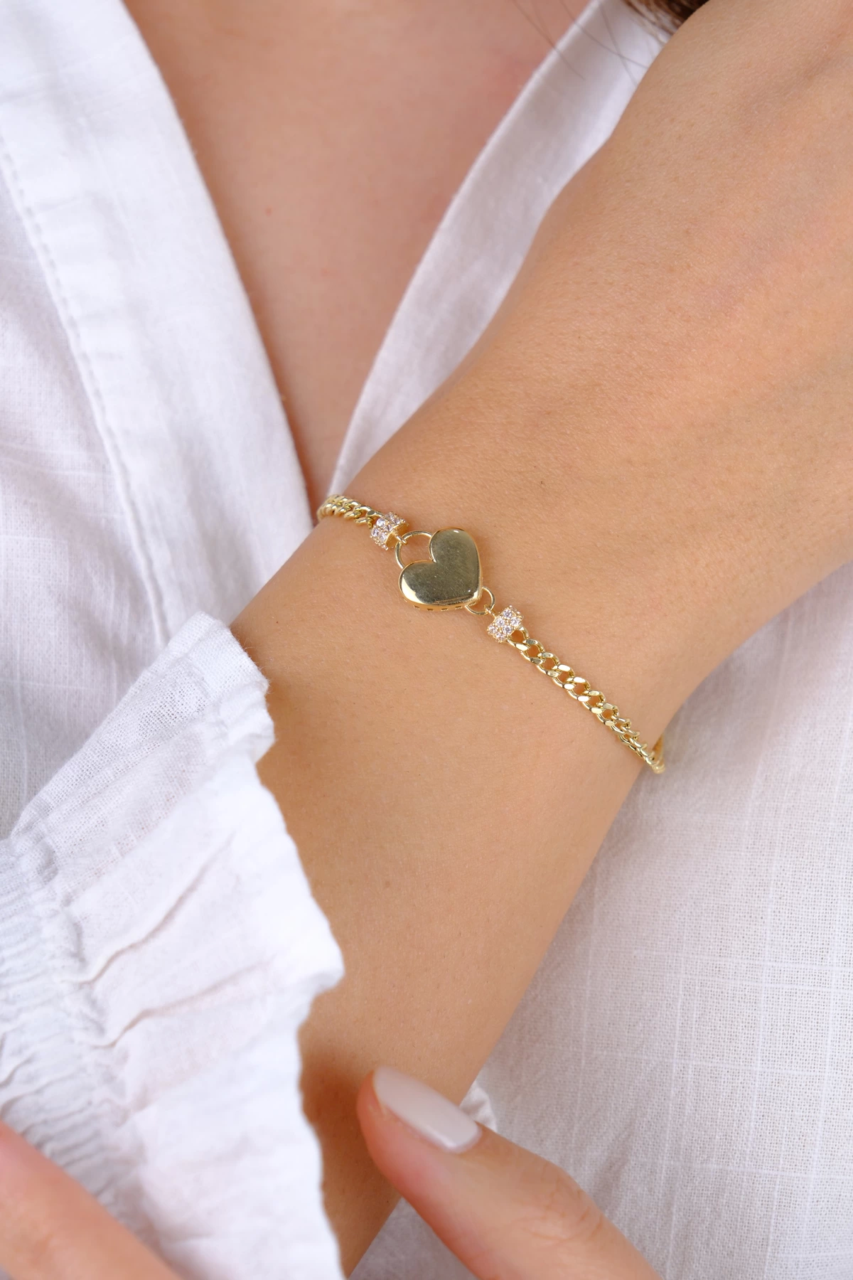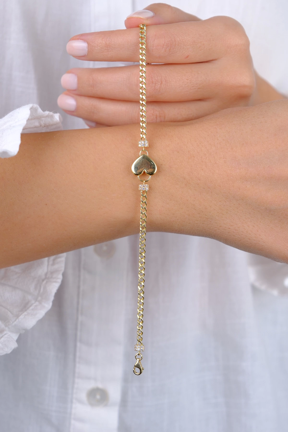 14 Ayar Altın Taşlı Kalpli İnce Gurmet Zincir Bileklik 808