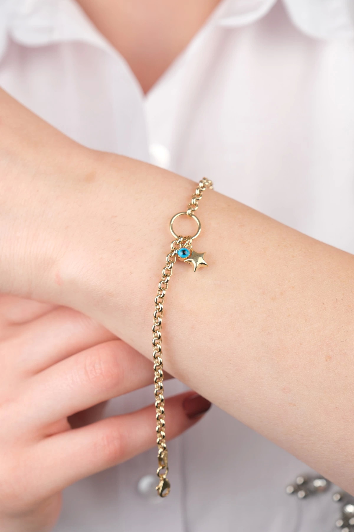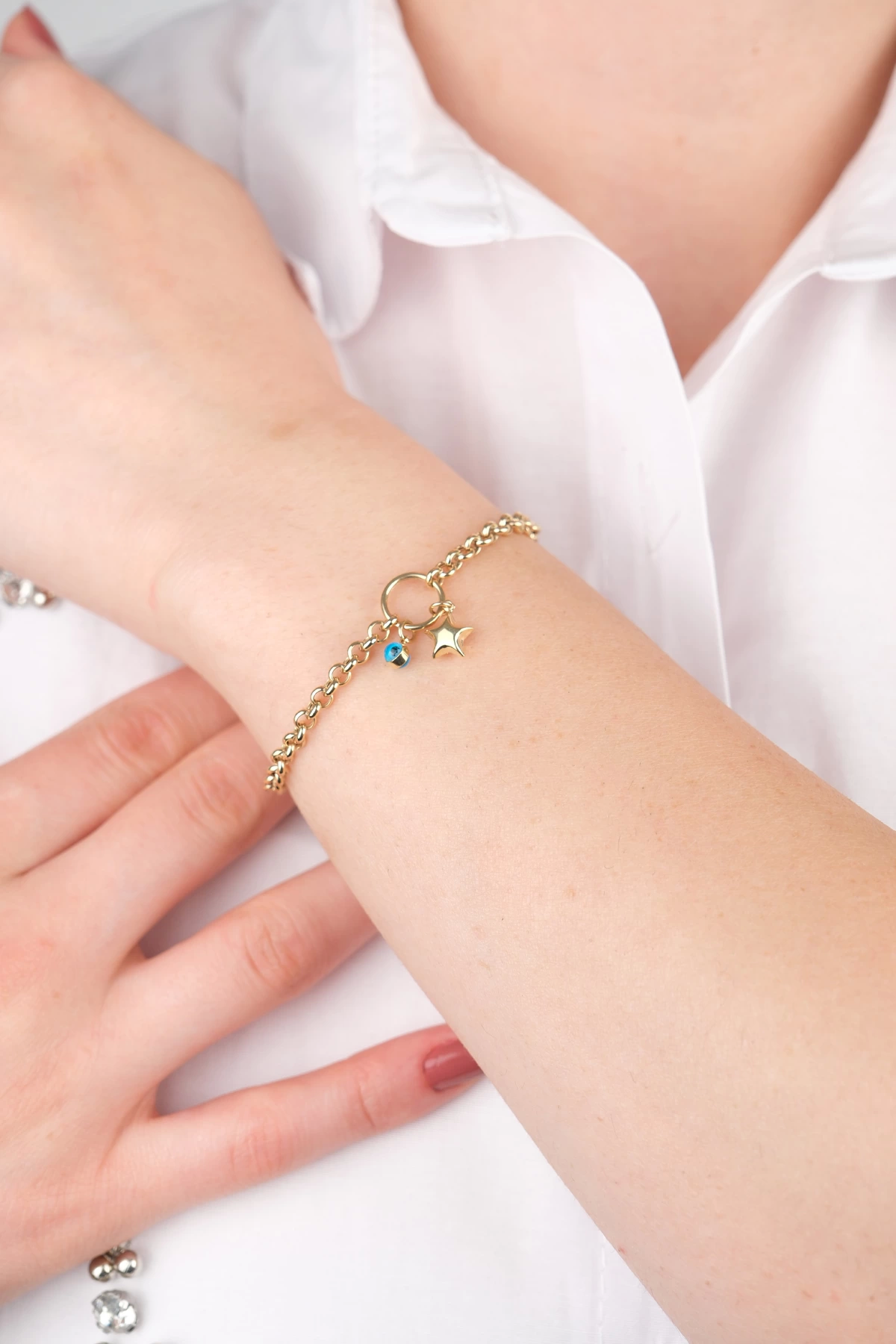 14 Ayar Altın Yıldızlı Nazar Boncuklu Zincir Bileklik 666
